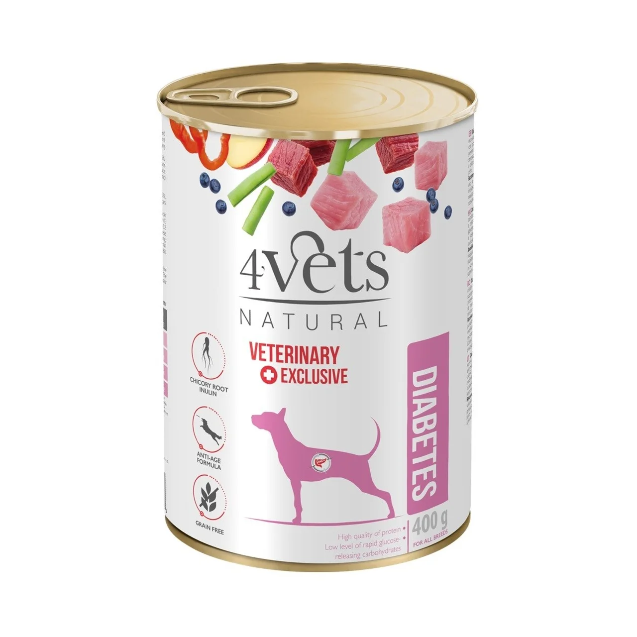 4VETS Natural Diabetes Dog märgtoit on spetsiaalselt loodud koertele, kellel esineb diabeet, ülekaal või kalduvus kehakaalu tõusule. Tootes on rõhk seatud glükoosi vabanemise aeglustamisele ning tasakaalustatud energiaväärtusele, mis aitab koera veresuhkru taset paremini kontrolli all hoida ning toetab kehakaalu langust või säilitamist. Tänu koostisele sobib see toit hästi ka steriliseeritud, täiskasvanud ja eakatele koertele igast tõust ja suurusest.