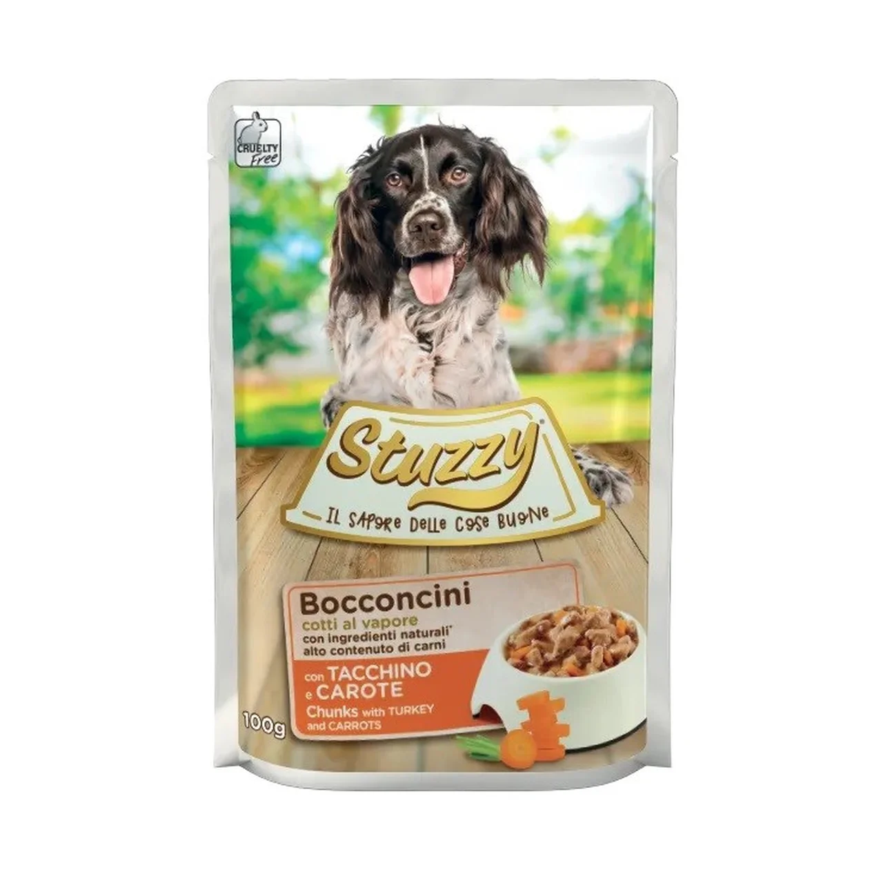 Stuzzy kalkuni ja porgandiga märgtoit on gluteenivaba täissööt täiskasvanud koertele, sisaldades 100 g aurutatud lihatükke ja köögivilju igapäevaseks toitmiseks.