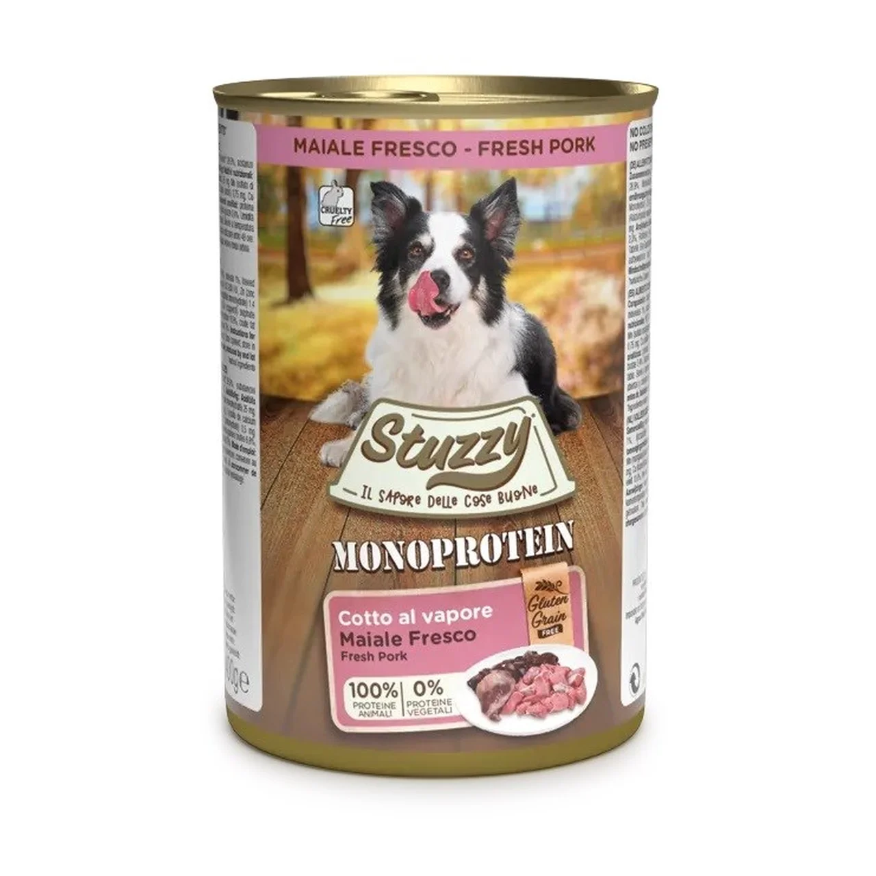Stuzzy Monoprotein sealiha märgtoit on teravilja- ja kanavaba täistoit täiskasvanud koertele, sobides eriti tundliku seedimise ning toiduallergiatega lemmikloomadele. Konserv sisaldab 400 g värsket sealiha ning ei sisalda säilitusaineid ega kunstlikke värvaineid.