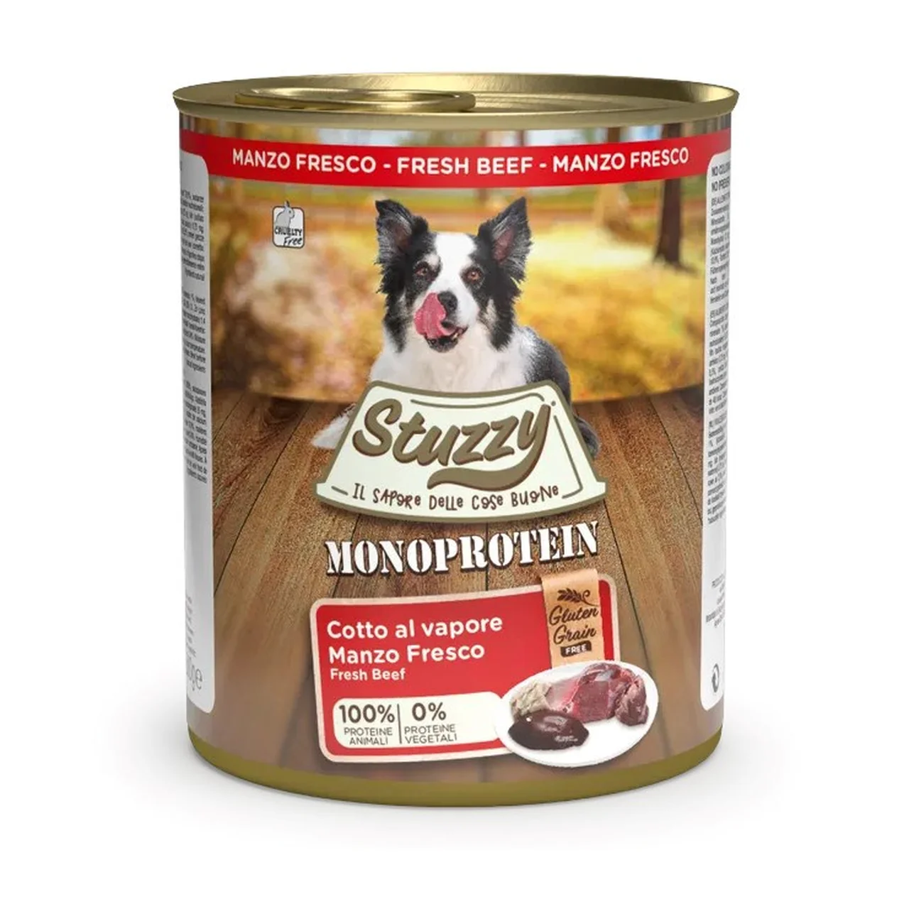 Stuzzy Monoprotein Beef on täissööt, mis on loodud täiskasvanud koertele, kellel on allergiad või tundlik seedimine. Agras Pet Foodsi kvaliteedigarantii näitab, et konservis on kasutatud ainult ühte loomset valguallikat – värsket veiseliha. Toit sobib kõigile koeratõugudele ning on säilitusainete- ja kunstlike värvainetevaba, lisaks ei sisalda see teravilja, gluteeni ega sojat.