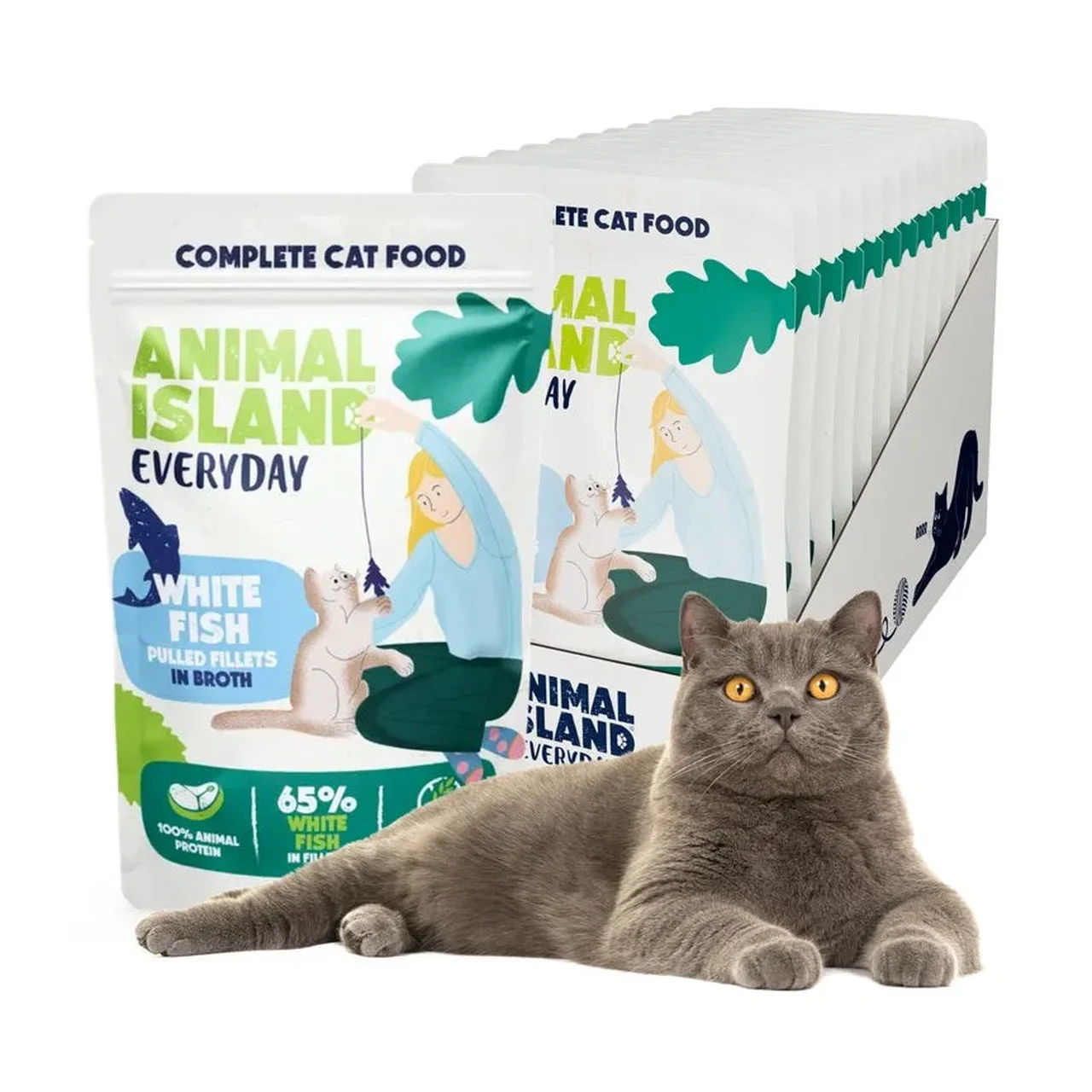ANIMAL ISLAND Everyday 12 x 85g valge kala fileed kastmes täiskasvanud kassidele, gluteeni- ja teraviljavaba märgtoit