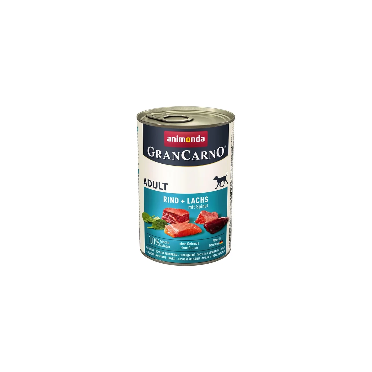 Animonda GranCarno Adult lõhe ja spinatiga 400g on gluteenivaba märgtoit täiskasvanud koertele, mis toetab seedimist ja sobib kõigile tõugudele.