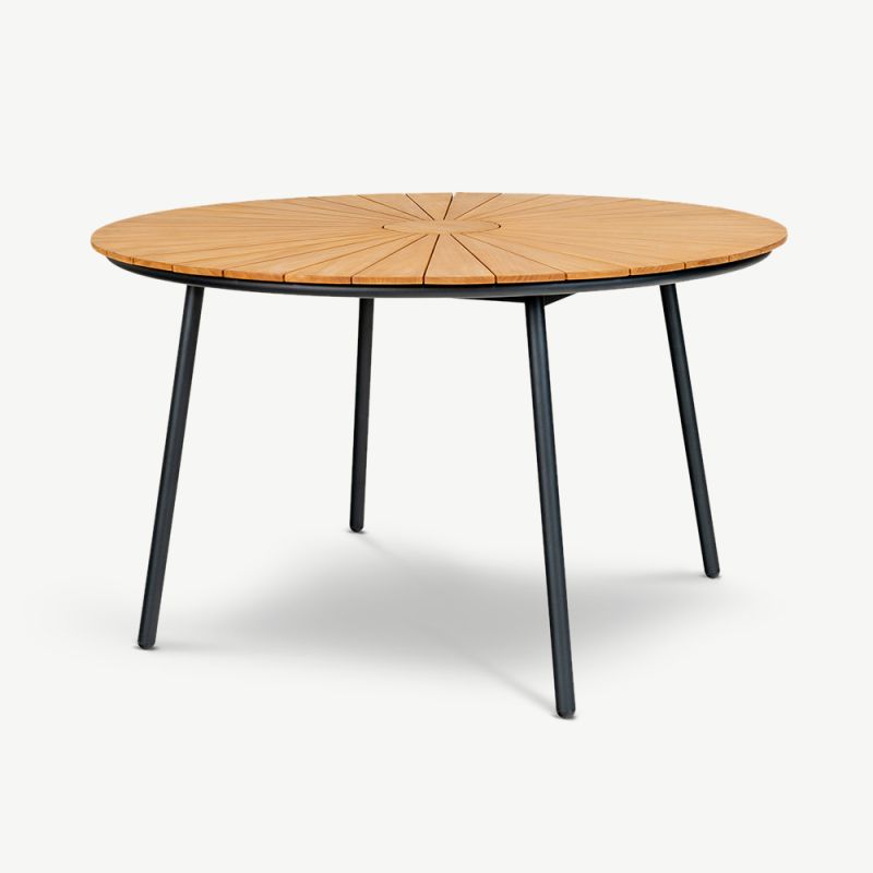 130 cm läbimõõduga Beckett aiasöögilaud mahutab kuni neli inimest, olles samal ajal piisavalt kompaktne, et sobituda ka väiksematesse aianurkadesse või rõdudele. Selle naturaalsest tiigipuust pind on vastupidav ja ilmastikukindel, muutes laua ideaaliks nii katusealustele terrassidele kui ka avatud õuealadele.