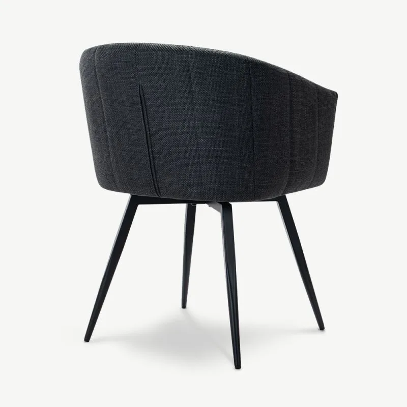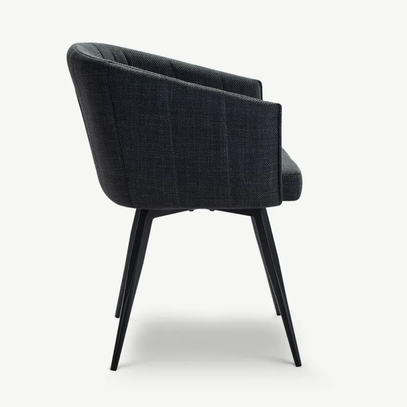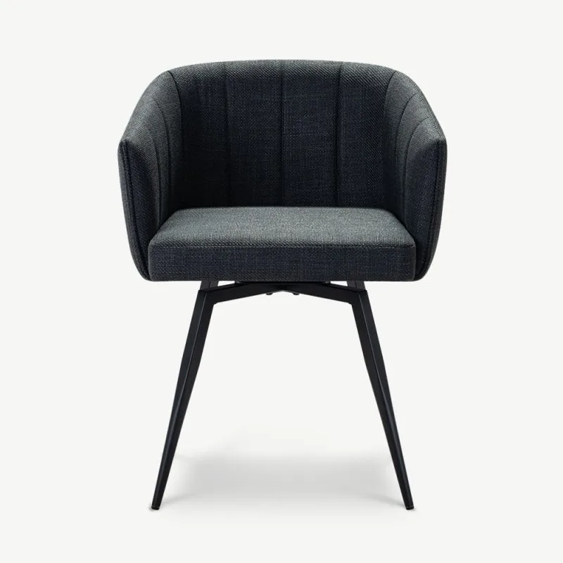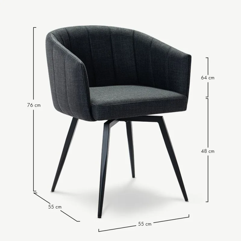 Ben pöördtoimeline söögitoa tugitool ühendab stiilse disaini ja praktilise mugavuse. Selle elegantne tumehall kangaskate koos ribistatud seljatoega loob modernse ilme, samas kui tugevad mustaks viimistletud metallist jalad tagavad vastupidavuse. Tänu pöördmehhanismile on tool eriti funktsionaalne ja mitmekülgne.