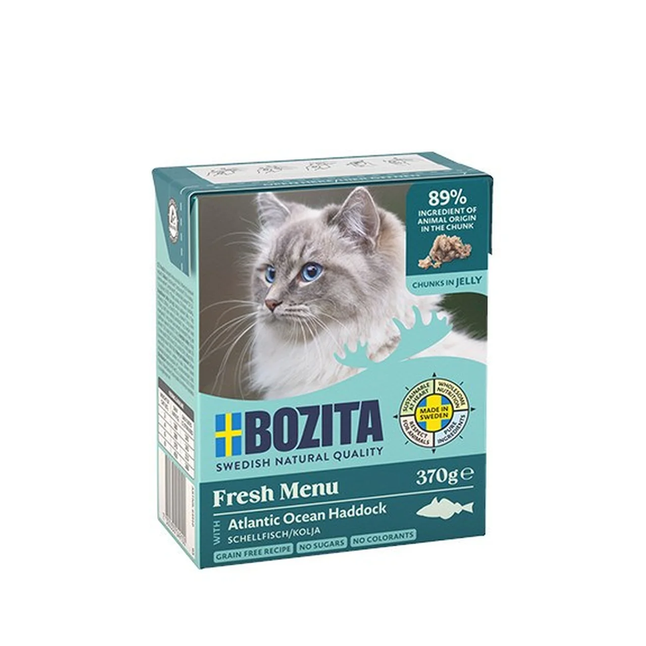 Bozita Fresh Menu valgekalaga märg kassitoit on viljavaba täistoit täiskasvanud kassidele, mis sisaldab 89% loomseid koostisosi ega sisalda lisatud suhkruid ega kunstlikke värvaineid.