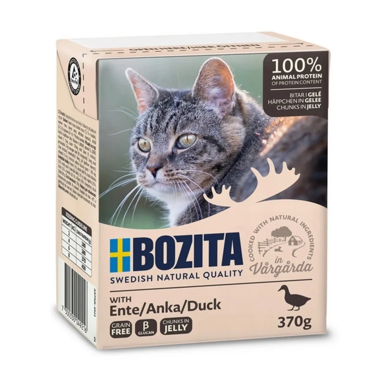 Bozita Duck in Jelly on kvaliteetne pardilihaga märg kassitoit, mis sobib iga tõu täiskasvanud kassidele. Toode on loomuliku koostisega – ei sisalda säilitusaineid, suhkrut ega sojat ning on täielikult teraviljavaba. Sobib hästi ka tundliku seedimise või ülekaaluga kassidele. Valmistamisel kasutatakse naturaalseid koostisosi, mis pakuvad lemmikule tasakaalustatud toitu, toetades tema üldist tervist ja heaolu.