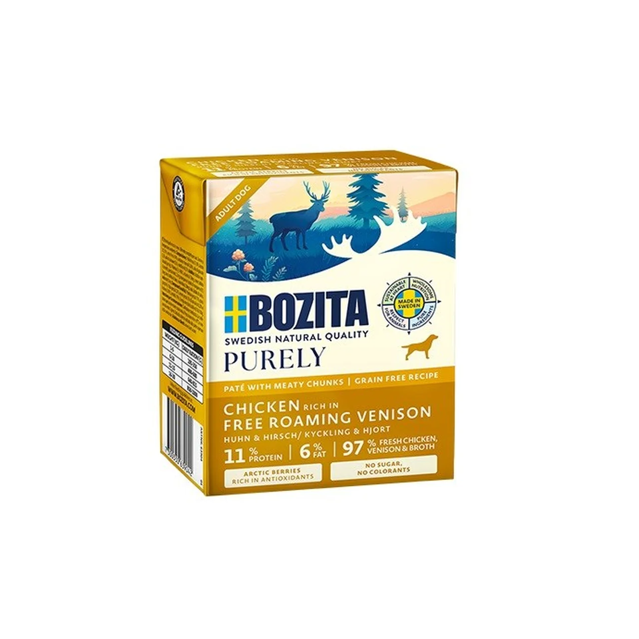 Bozita Purely Paté Duoprotein Chicken and Venison on kvaliteetne märgtoit, mis on välja töötatud täiskasvanud koertele, sh tundliku seedimise või toiduallergiaga lemmikutele. Teravilja- ja gluteenivaba retsept sisaldab kõrge loomse valgu sisaldusega kanalihast ja vabalt elanud hirveliha, pakkudes tasakaalustatud toitu igas suuruses koeratõugudele. 370 g kartongpakendis märgtoit ei sisalda kunstlikke värvaineid, lisatud suhkrut ega soja, mis teeb toote sobivaks ka nõudlikele koeraomanikele.