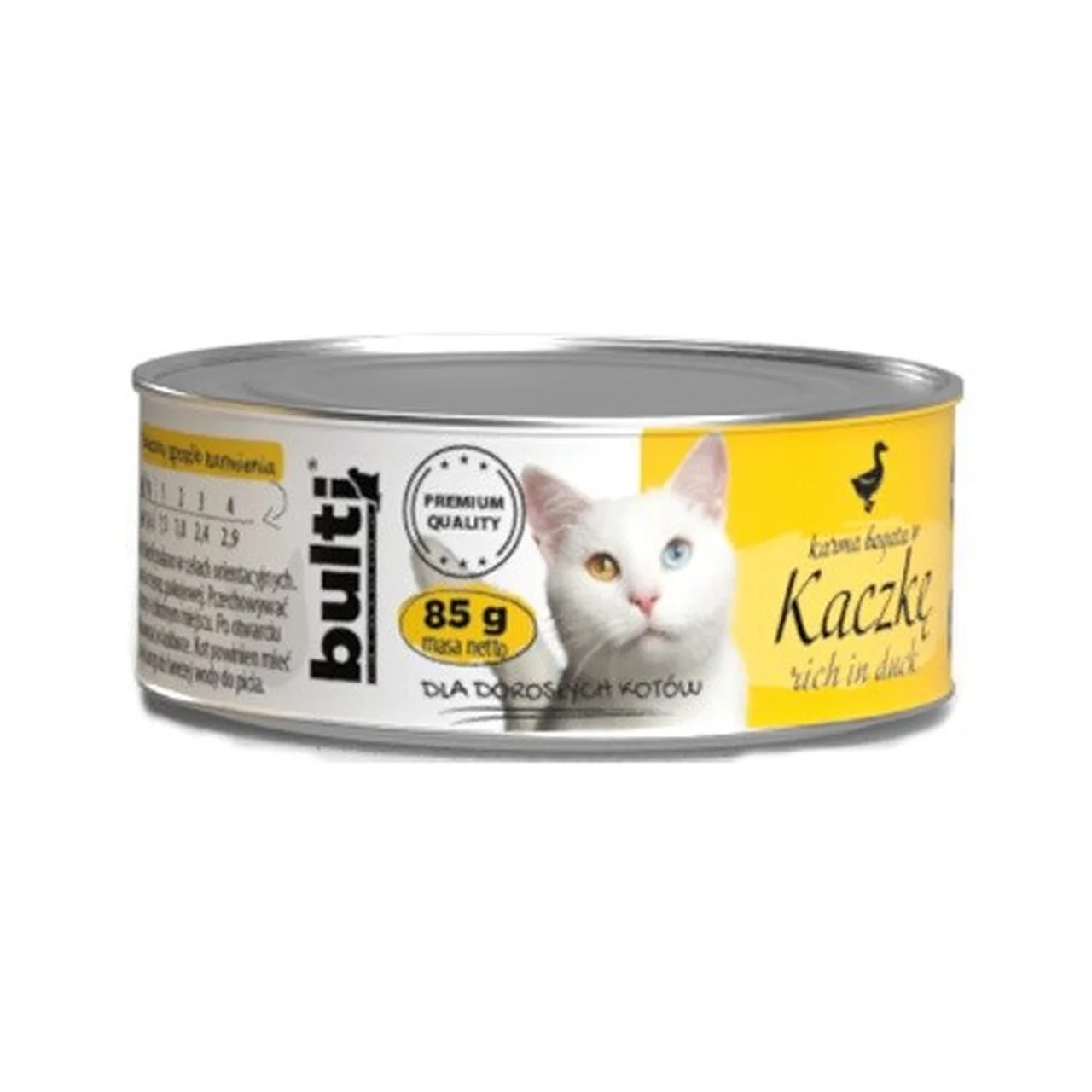 Bult Rich in Duck on tasakaalustatud ja täisväärtuslik märg kassitoit, mis on mõeldud täiskasvanud kassidele. Toode põhineb kvaliteetsel pardilihal ning sobib igapäevaseks toitmiseks kõikidele kassitõugudele. Gluteenivaba koostis teeb selle sobivaks ka tundliku seedimisega lemmikutele. Kõrge niiskusesisaldus aitab kassil püsida hästi hüdreeritud ning toetab üldist tervist. Toodetes ei ole kunstlikke värvaineid ega suhkrut ning ei sisalda soja. Kompaktne 85 g metallpurk on lihtsalt avatav ja sobib mugavaks serveerimiseks.