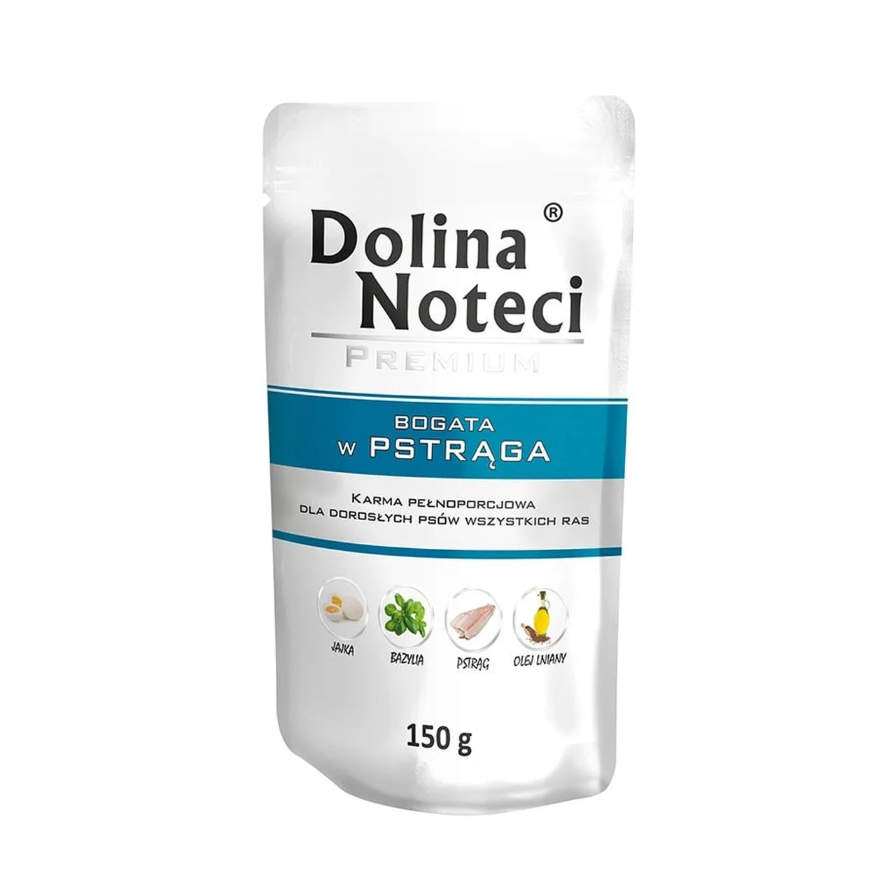 Dolina Noteci Premium 150g forellimaitseline märgtoit koerale on tasakaalustatud, teraviljavaba märgtoit täiskasvanud koertele, mis sisaldab kvaliteetset kalavalku ja olulisi vitamiine.