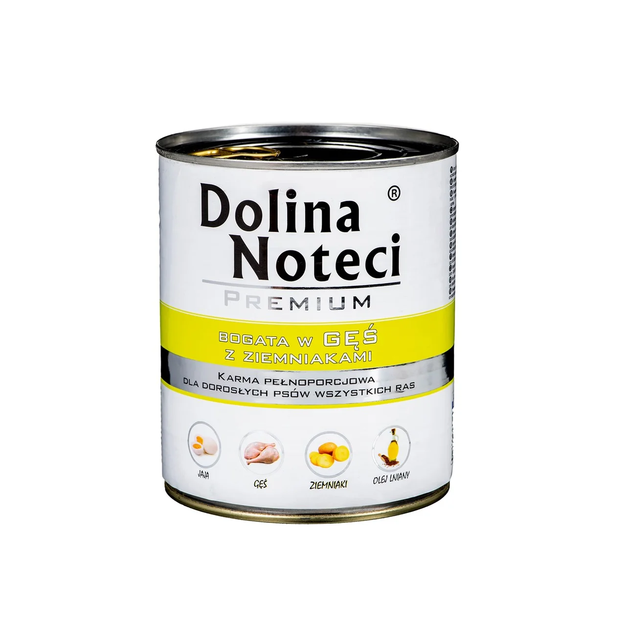 Dolina Noteci Premium Rich in Goose with Potatoes on täissööt täiskasvanud koertele, mis sobib kõikide tõugude esindajatele. Retsept on kanavaba ning teravilja- ja gluteenivaba, sobides ka tundliku seedimise või toidutundlikkuse korral. Mõõdukas rasvasisaldus ja kõrge niiskus tagavad hästi söödava märgtoidu, mida on lihtne serveerida igapäevaseks toidukorraks. Pakend: 800 g metallpurk.