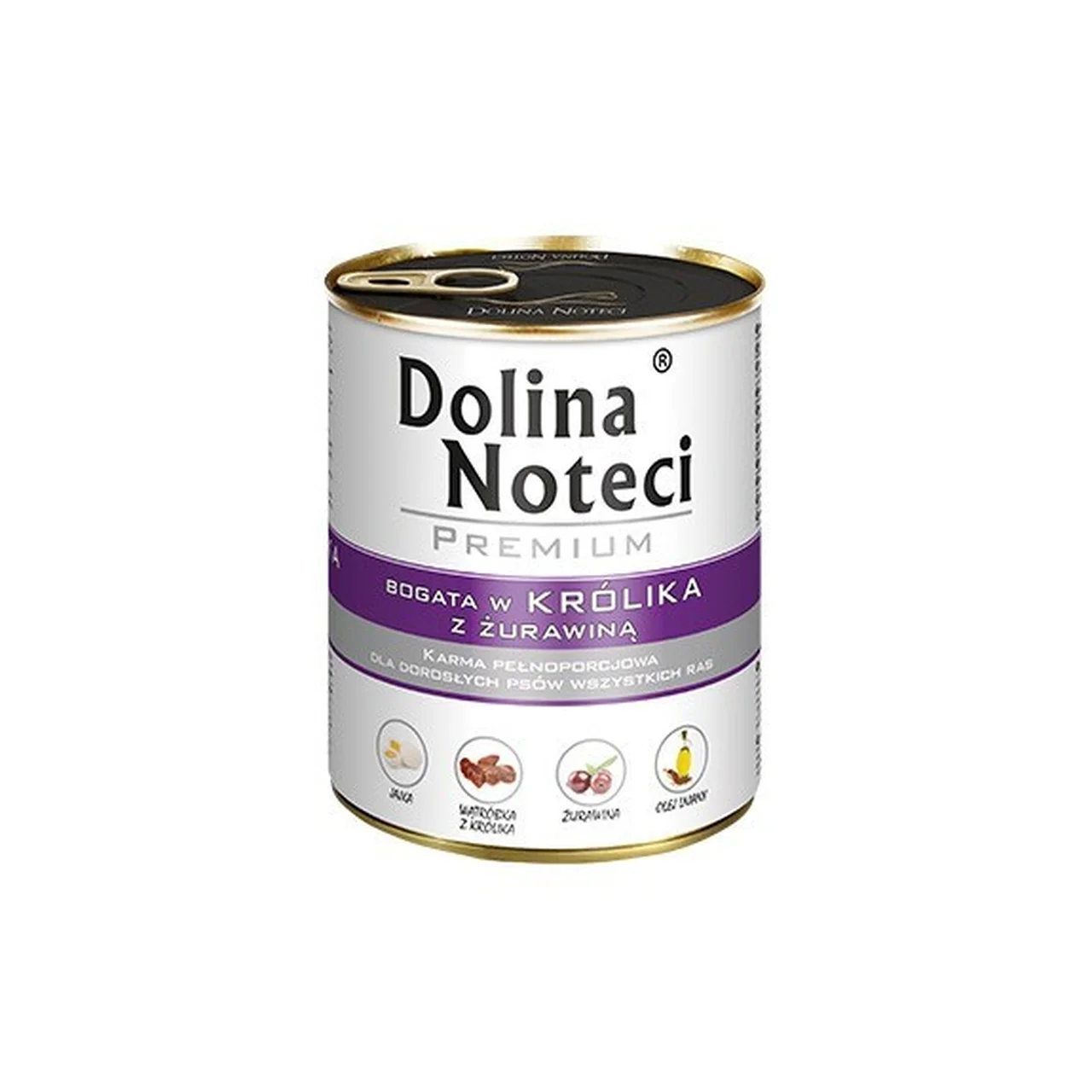 DOLINA NOTECI Premium Rich in rabbit with cranberries on täissööt-märgtoit täiskasvanud koertele (kõik tõud ja suurused). Retseptis on kõrge loomse päritolu osakaal (veis, küülik, sealiha) ning lisatud jõhvikas ja psüllium seedimise toetuseks. Toit on teravilja- ja kanavaba, ilma lisatud suhkruta ning ilma kunstlike värv- ja säilitusaineteta. 800 g plekkpurk on rõngasavaga, mis teeb avamise lihtsaks.