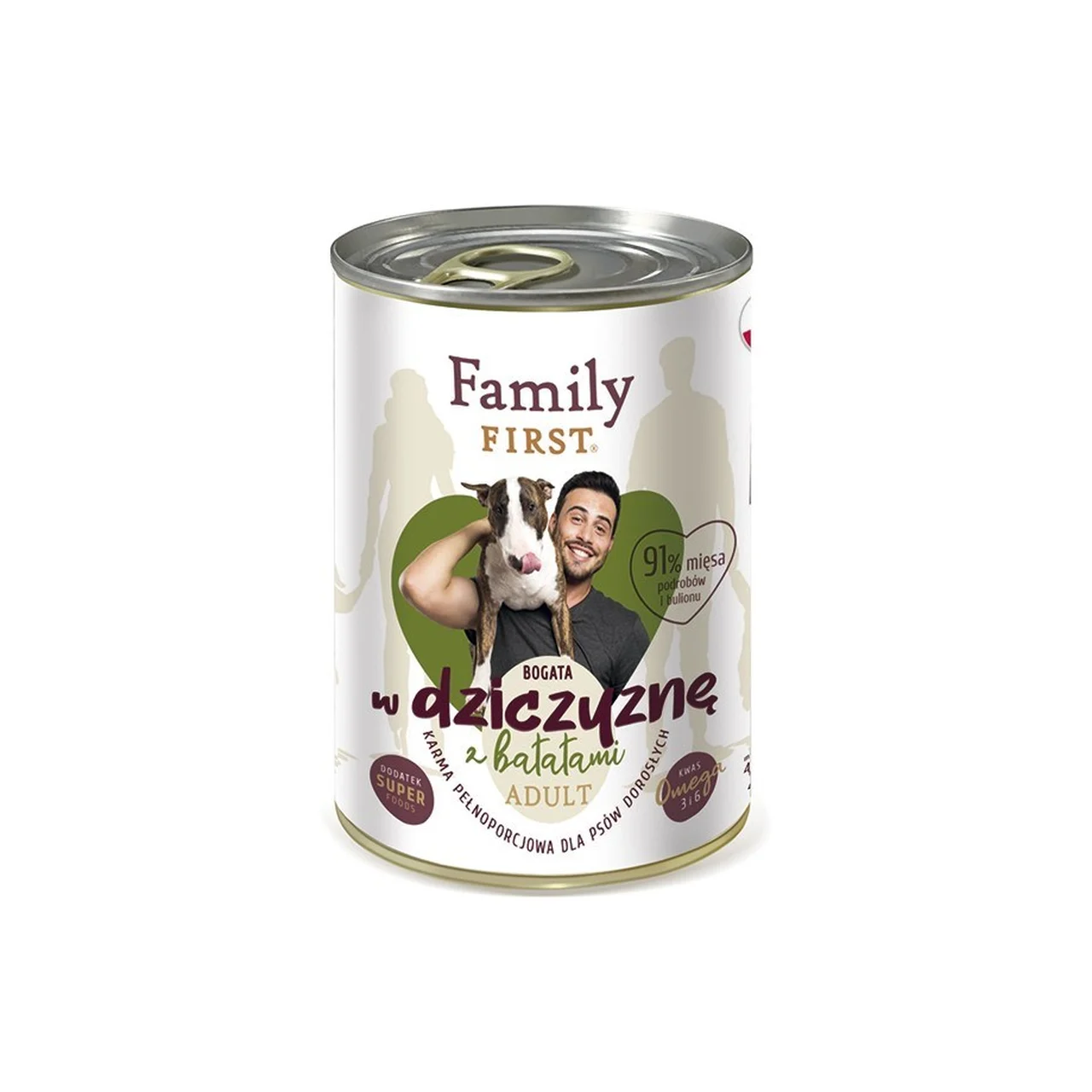 Family FIRST Adult Venison with Sweet Potatoes on täissööt täiskasvanud koertele igas suuruses ja igast tõust. See märg koeratoit, mille peamisteks koostisosadeks on ulukiliha ja bataat, sobib igapäevaseks kasutamiseks ning toetab sinu koera üldist tervist. Toode on vaba kunstlikest värvainetest, maitsetugevdajatest ja säilitusainetest ning sisaldab ainult vajalikke komponente, et pakkuda kvaliteetset ja tasakaalustatud toitu koerale. Tänu gluteeni-, soja- ja suhkruvabale koostisele sobib see hästi ka tundlikuma seedimise või toidutalumatusega koertele.