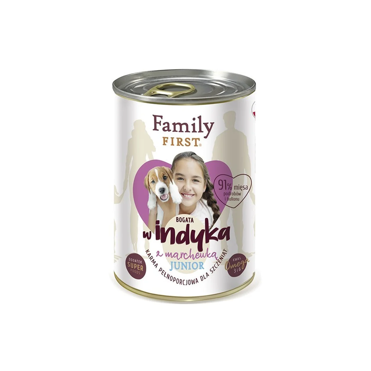 Family FIRST Junior Turkey with carrots on loodud kutsika tervise ja arenguperioodi toetamiseks – koostisosad on hoolikalt valitud, et tagada maitsev ja toitev eine. Toode sobib kõikidele tõugudele ning selle puhas koostis ja allergeene välistav retsept sobib ka tundliku seedimisega noorele koerale. Gluteenivaba ja lisanditeta märgtoit tagab hea seeduvuse ning toetab kutsika energiataset ja üldist heaolu.