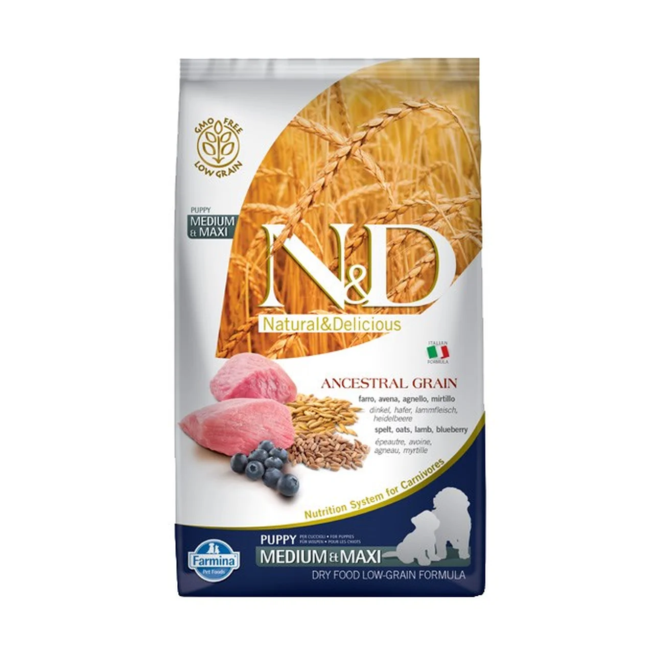 Farmina N&D Ancestral Grain Puppy Medium&Maxi Lamb on lambalihaga kuivtoit suurtele kutsikatele ning tiinetele ja imetavatele emastele koertele. Toetab liigeste tervist ja üldist heaolu. Sisaldab kvaliteetseid teravilju ning ei sisalda kunstlikke säilitusaineid.