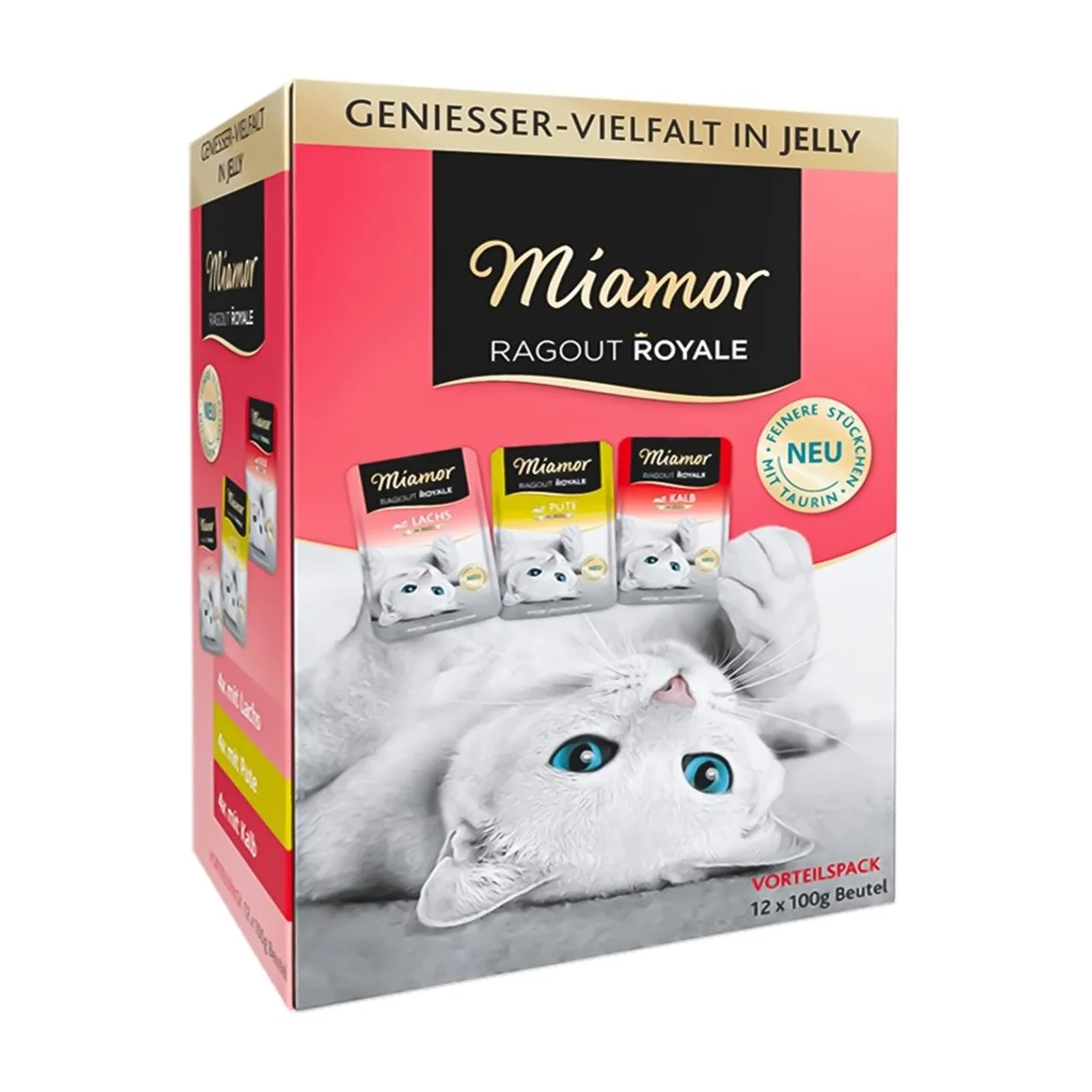 Miamor Ragout Royale Adult Mix in jelly on täiskasvanud kassidele kvaliteetne märgtoit, mis ühendab kolm erinevat maitset mugavas 12 x 100 g pakendis. See täissööt sobib igat tõugu kassidele ning toetab nende üldist tervist, olles samal ajal teravilja-, gluteeni- ja sojavaba. Õrnad raguu-tükid maitserikkas želees pakuvad kassile nauditava toiduelamuse iga toidukorraga.