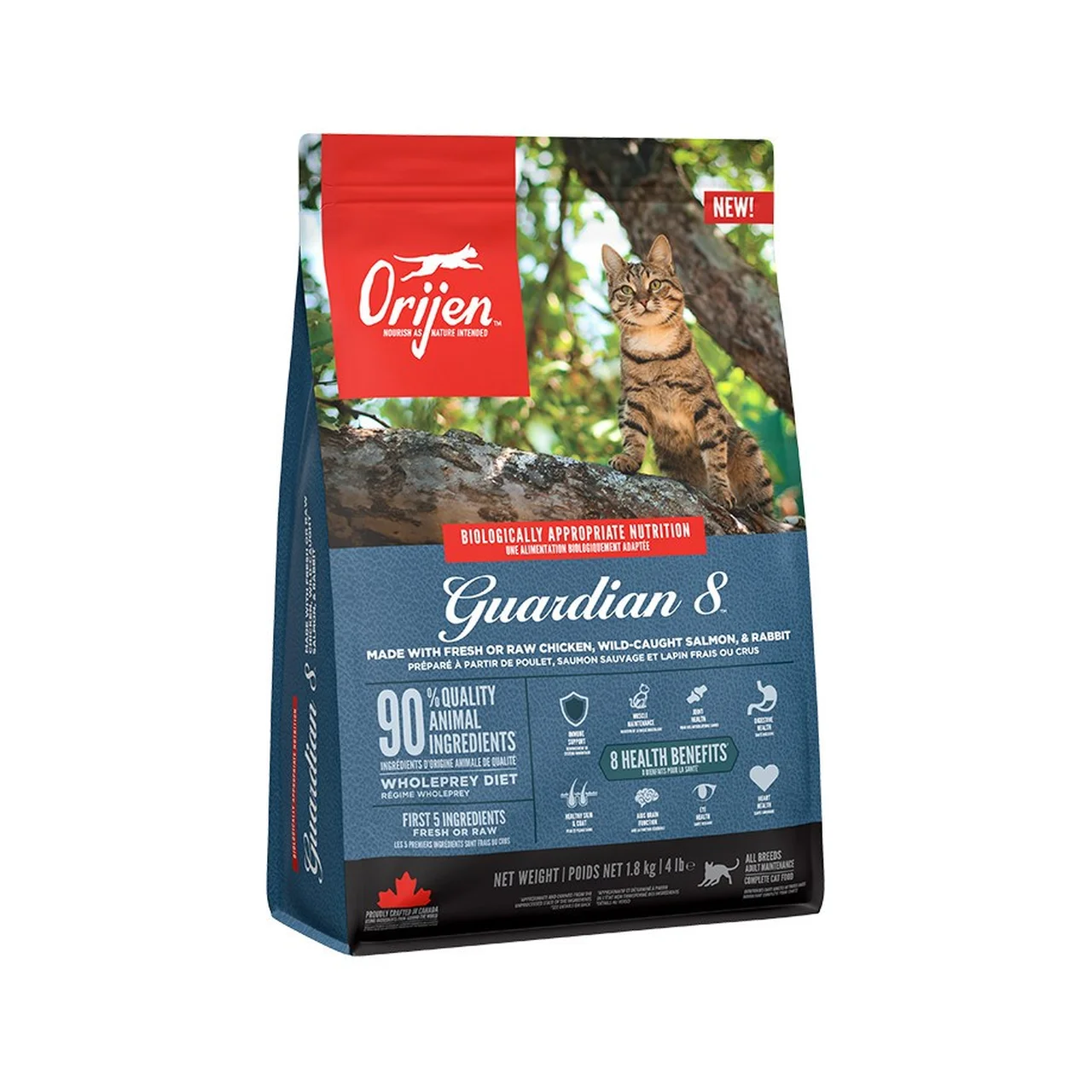 Orijen Guardian 8 on 1,8 kg teraviljavaba kuivtoit täiskasvanud kassidele, mis sisaldab 90% loomseid koostisosi ning toetab kassi üldist tervist. Toidus on ühendatud kana ja lõhe maitse ning see sobib kõikidele tõugudele.