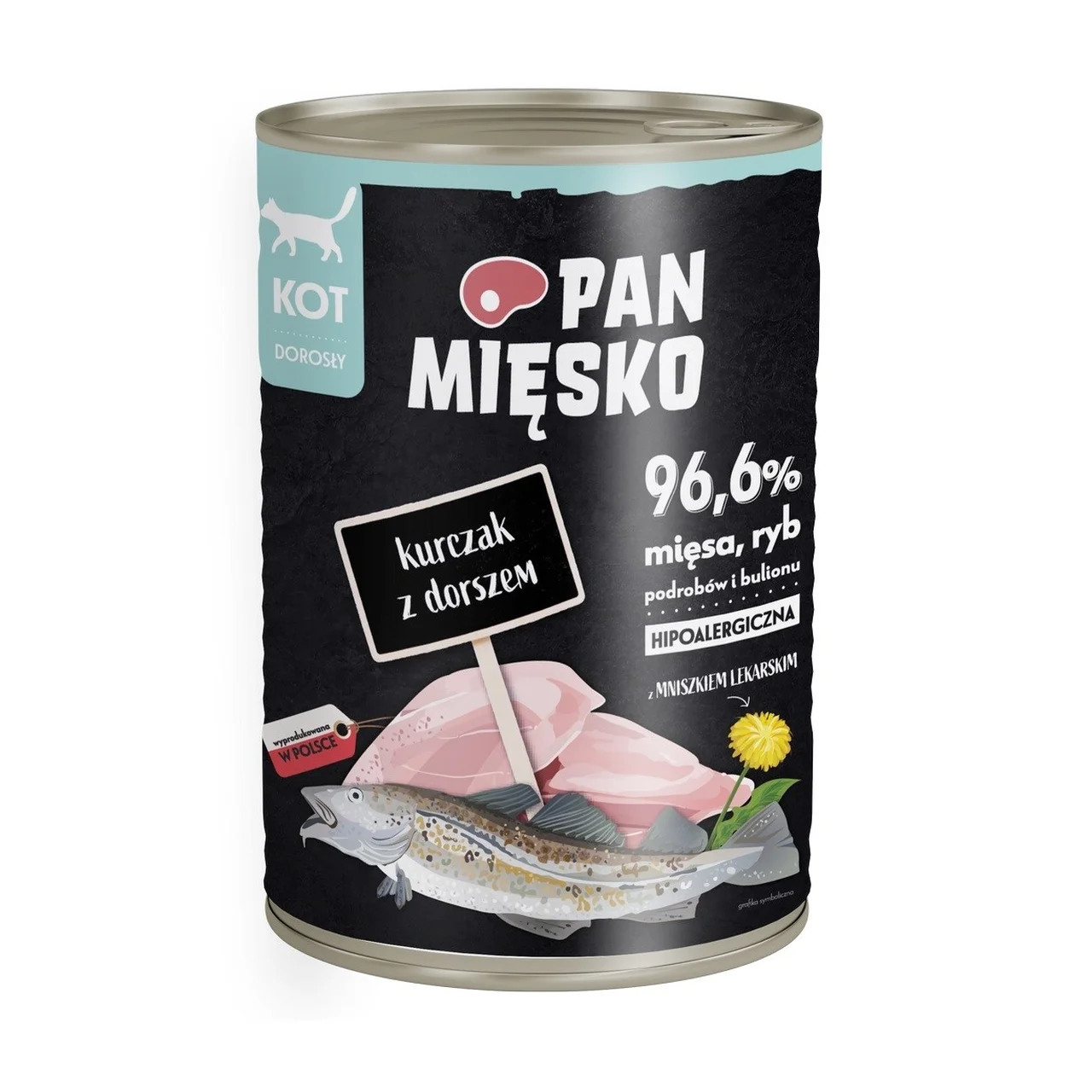 PAN MIĘSKO Chicken with cod 400g märgtoit on täisväärtuslik ja tasakaalustatud konserv täiskasvanud kassidele. Kõrge liha- ja kalasisalduse ning täiesti teravilja-, gluteeni- ja sojavaba koostise tõttu sobib see eriti hästi toiduallergiatega või tundliku seedimisega kassidele. Valmistatud ilma kunstlike värvainete ja lisatud suhkruta, tagades sinu lemmikule kvaliteetse ning looduslähedase toiduelamuse.