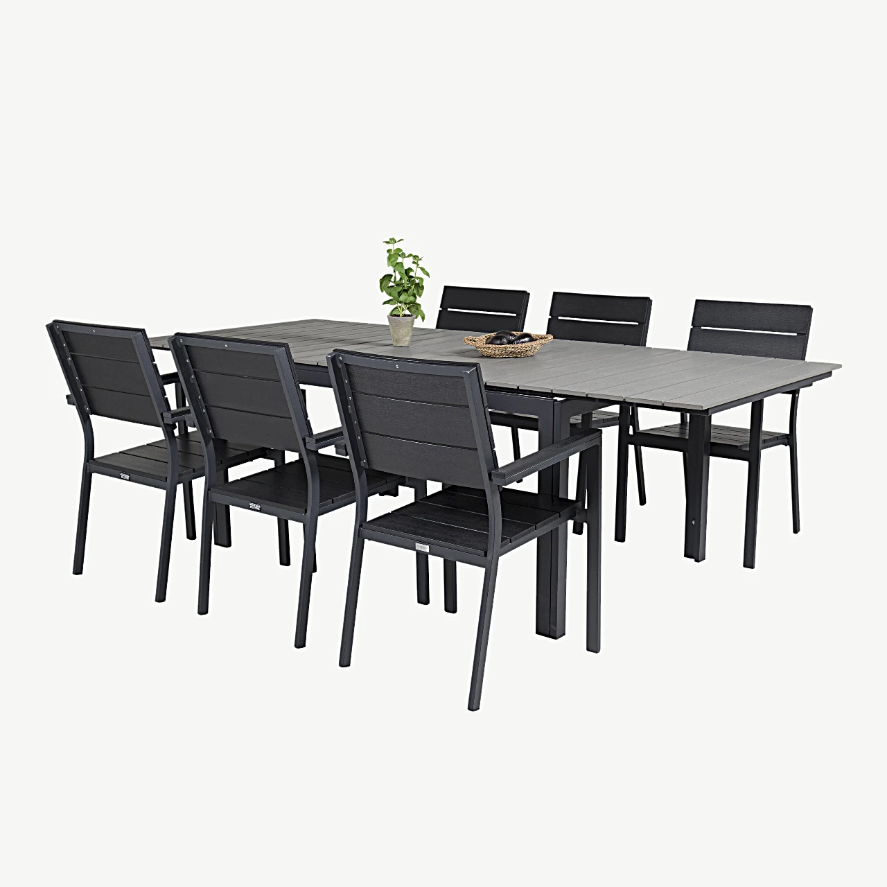 Minimalistlik põhjamaine disain, sirged jooned ning tagasihoidlikud mustad ja hallid toonid teevad sellest aiadiningukomplektist sobiva valiku igasse väliruumi.