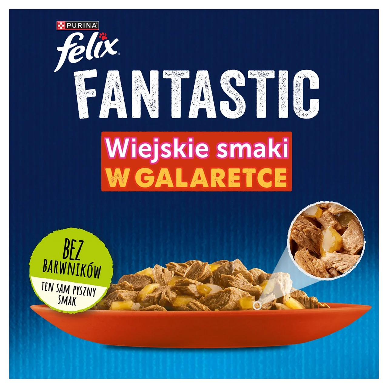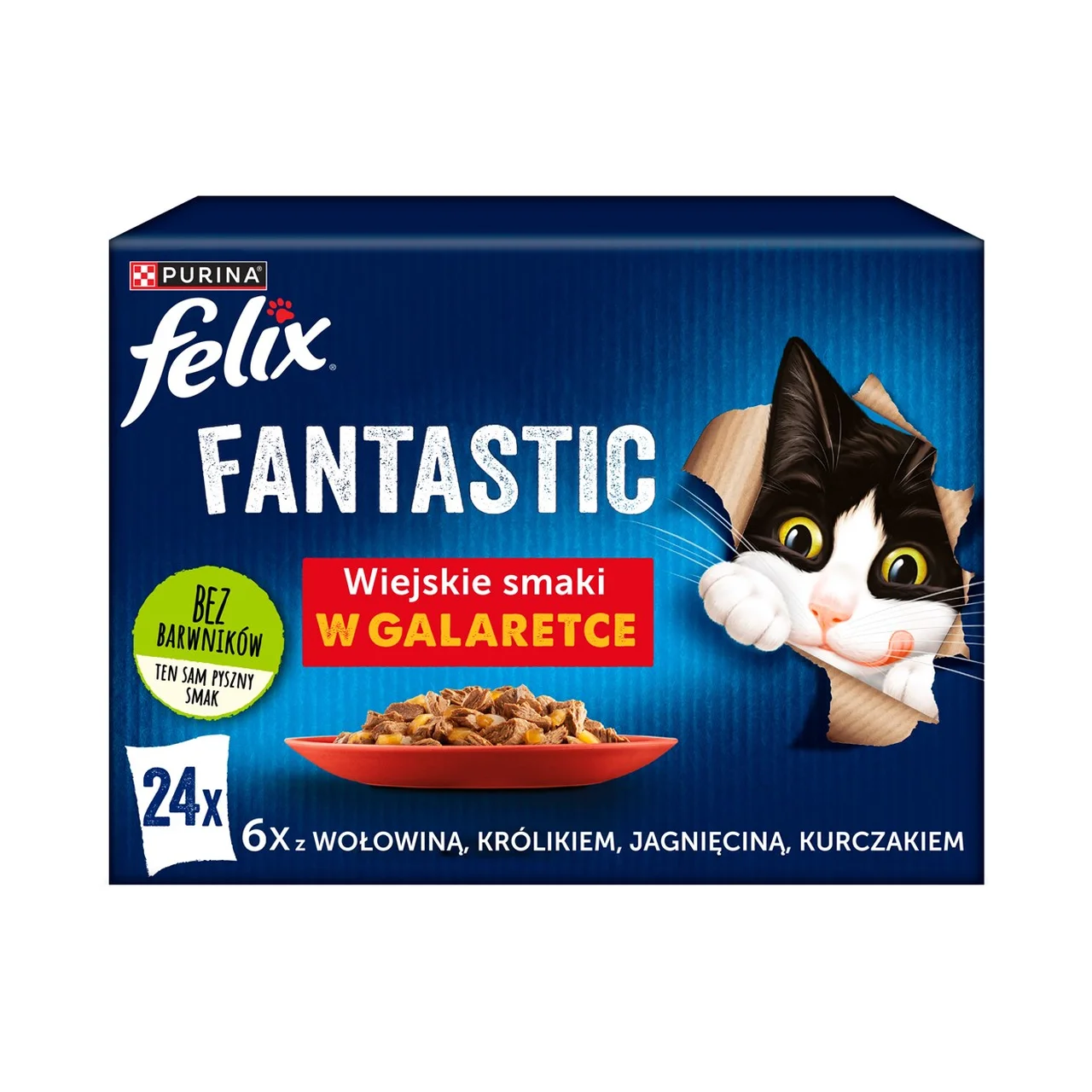 Felix Fantastic Country Flavours in Jelly on täisväärtuslik märgtoit kassidele, sisaldades 24 portsjonit veise-, kana-, jänese- ja lambaliha erinevates maitsetes. Sobib igas suuruses täiskasvanud kassile igapäevaseks toidukorraks.