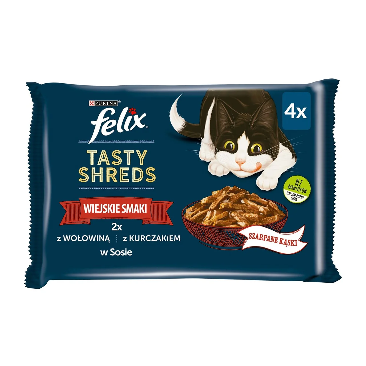 See märgtoit erineb teistest oma maitsvate, rebitud liharibade ja naturaalse koostise poolest. Felix Tasty Shreds ei sisalda kunstlikke värvaineid ega säilitusaineid, pakkudes tervislikumat alternatiivi paljudele teistele kaubanduses saadavatele kassitoitudele. Kaste tagab ka väga hea vedelikutarbimise ja muudab toidu eriti isuäratavaks.