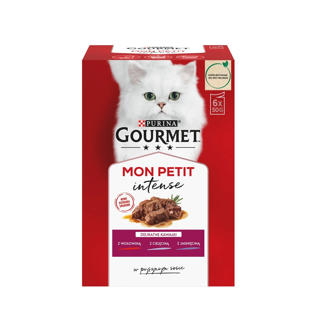 Purina Gourmet Mon Petit märgtoidu assortii sisaldab 6 x 50 g portsjonit veise-, vasika- ja lambalihaga, sobides igapäevaseks täissöödaks täiskasvanud kassidele.