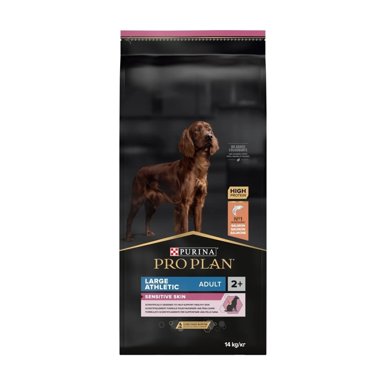 Purina Pro Plan Sensitive Skin Large Athletic Adult Salmon 14 kg on tasakaalustatud kuivtoit, mis on spetsiaalselt loodud suurtele atleetlikele täiskasvanud koertele (tõusuurus 26–44 kg). See toit toetab tundlikku nahka ja läikivat karvkattet tänu hoolikalt valitud koostisosadele, sealhulgas kvaliteetsele lõhele. Sobib koertele, kellel esineb toidutundlikkust või kelle karvkate ja nahk vajavad lisatoetust.