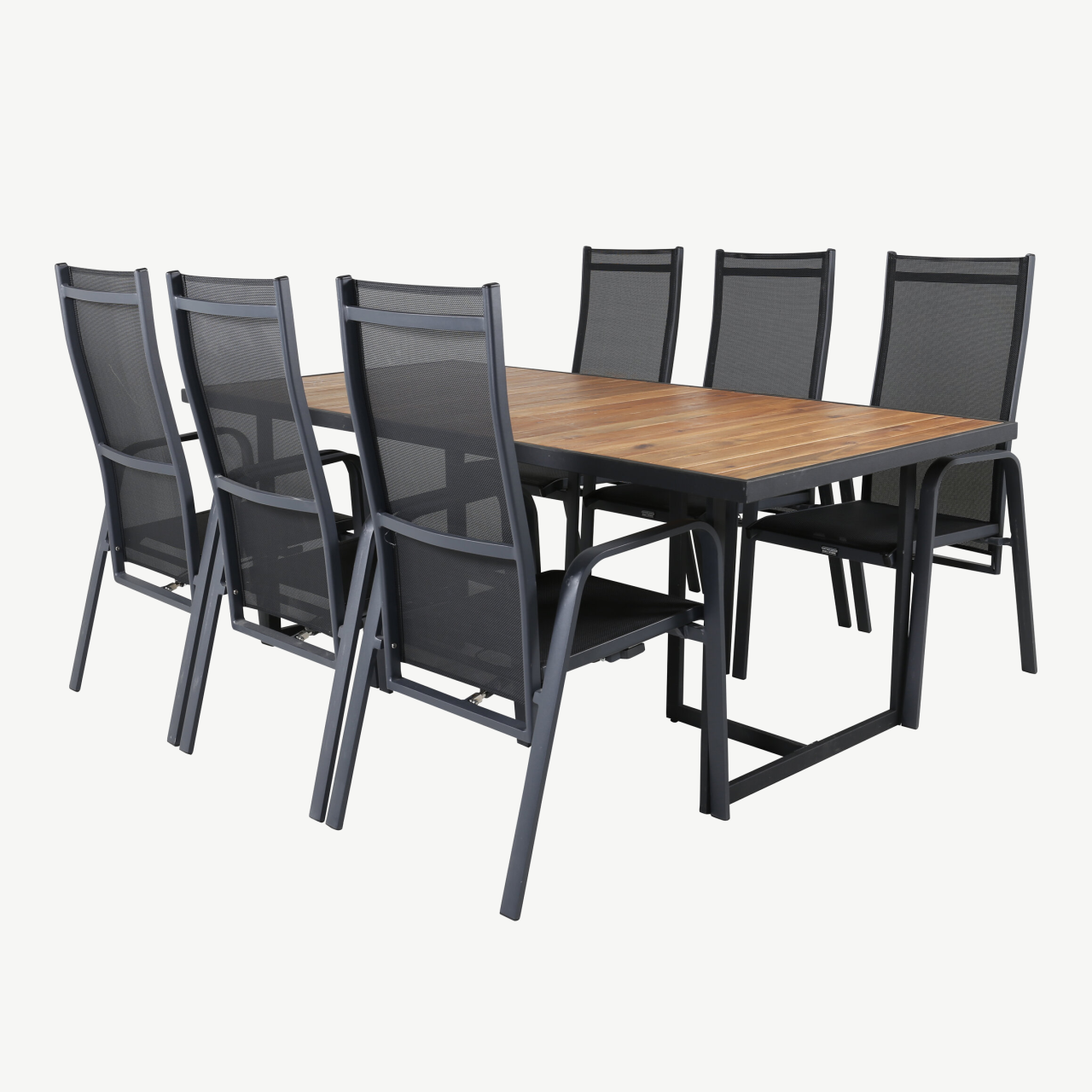 Khung aiamööbli komplekt ühendab endas modernse disaini ning maksimaalse mugavuse, pakkudes ideaalset lahendust suvisteks õhtusöökideks pere ja sõpradega. Komplekti kuulub mahukas ristkülikukujuline söögilaud naturaalsest akaatsiapuidust ning kuus reguleeritavat, kõrge seljatoega musta Copacabana aiatooli. Tugevad materjalid ja põhjamaisele maitsele sobiv stiil teevad sellest akaatsiapuidust aiamööbli komplektist silmapaistva keskme igale õueruumile – nii terrassile kui ka aeda.