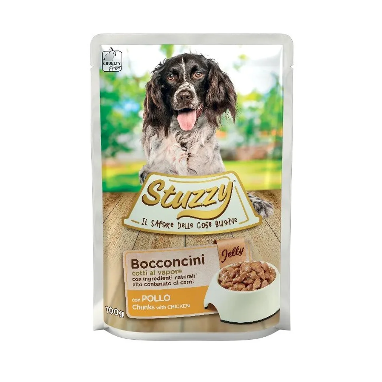 Stuzzy Chicken in Jelly on tükiline kanaga märgtoit igas suuruses täiskasvanud koertele, mis tagab tasakaalustatud toitumise ning sobib igapäevaseks söögikorraks.
