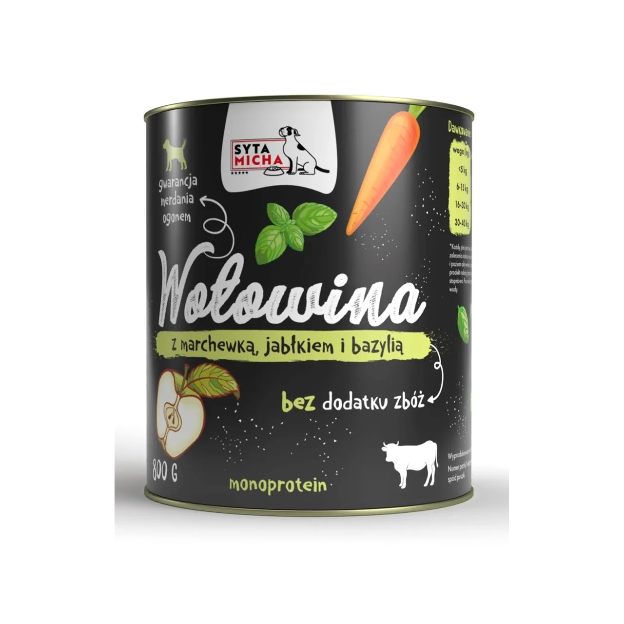 SYTA MICHA Beef with carrot, apple and basil on kvaliteetne märg koeratoit, mis on loodud täiskasvanud koertele, olenemata tõust või suurusest. Toode pakub igapäevast täisväärtuslikku einevalikut, sisaldades naturaalseid koostisosi nagu veiseliha, porgand, õun ja basiilik, ning tagab maitseelamuse ja oluliste toitainete olemasolu sinu lemmikule. Tänu monoproteiinsele ehk ainult ühte loomset valku sisaldavale retseptile sobib see eriti hästi tundliku seedimisega või eriliste toitumisvajadustega koertele.