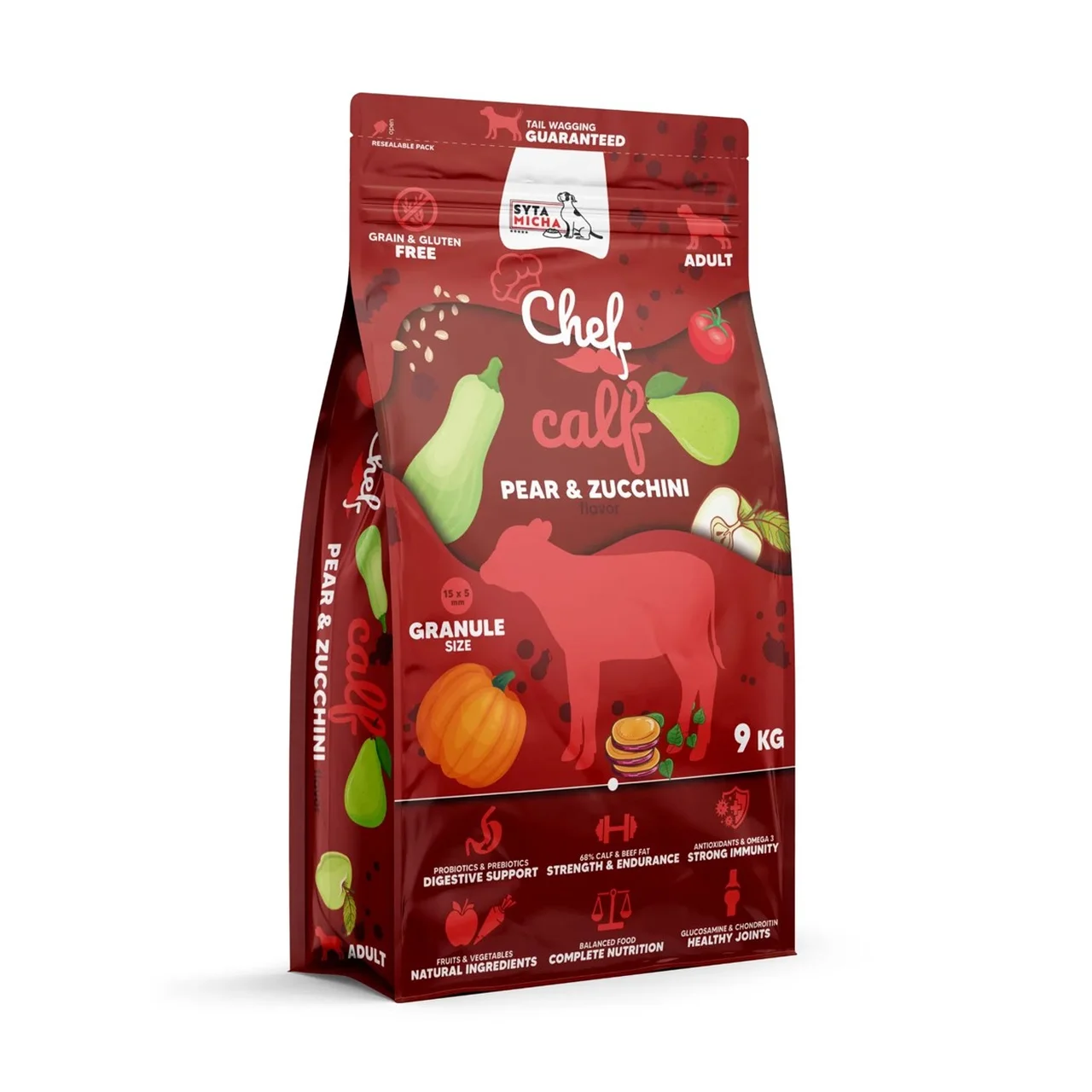 SYTA MICHA Chef vasikaliha kuivtoit täiskasvanud koerale pakub täisväärtuslikku toitu, sisaldades gluteenivaba vasikaliha, pirni ja suvikõrvitsat ning sobides kõikidele tõugudele.