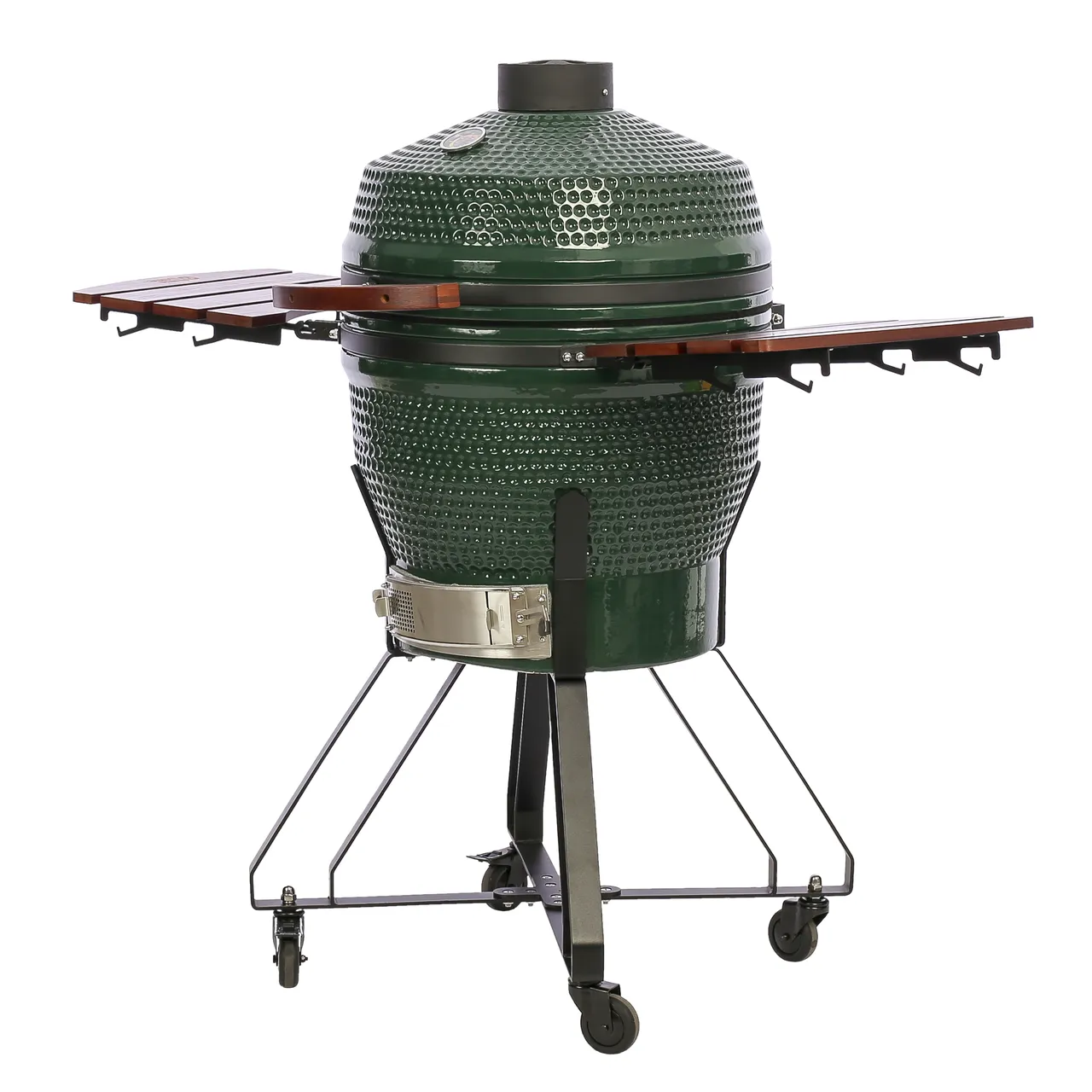 Keskmise suurusega roheline keraamiline Kamado Pro 22″ grill sobib kuni 8-le inimesele, komplektis külglauad ja vajalikud tarvikud.