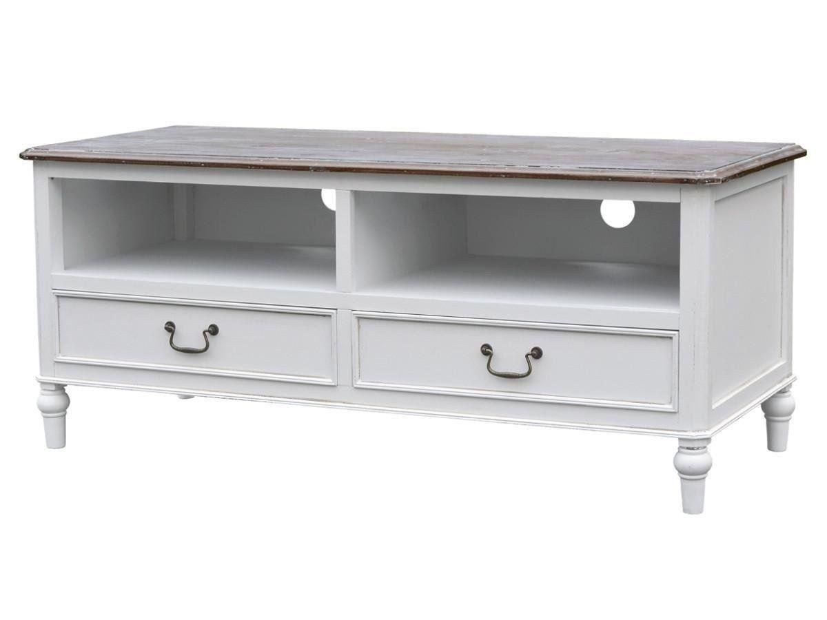 Ravenna RA034 TV-alus elutuppa. See elegantne Provencal stiilis TV-alus on kujundatud valge viimistlusega, millele lisab kontrasti ja soojust pühitud, tumepruun pealispind. Metallist käepidemed ja rullitud jalad annavad sellele mööblitükile iseloomuliku ja ajatu ilme, mis sobib suurepäraselt igasse elutuppa.