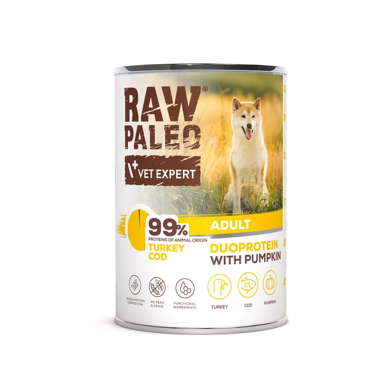 RAW PALEO Duoprotein Turkey & Cod Adult on tasakaalustatud märgtoit, mis on loodud spetsiaalselt täiskasvanud koertele, kellel esineb toiduallergiaid, tundlikku seedimist või toidutalumatust. Tootja VetExpert on ühendanud kvaliteetse kalkuni ja tursa, et tagada hea seeduvus, loomse valgu rohkus ning allergeenivaba kooslus. Toode sobib igas suuruses ja igast tõust koertele. Tootes puuduvad teravili, kana, soja, gluteen ja kunstlikud värvained, tänu millele sobib see eriti tundlikele koertele, aidates vähendada allergiaohtu ning seedimisprobleeme.