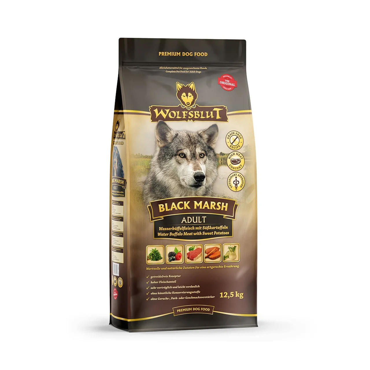 Wolfsblut Adult Black Marsh 12,5 kg on veepühvlilihaga gluteenivaba kuivtoit täiskasvanud koertele, sisaldab rikkalikult vitamiine ja sobib kõigile tõugudele.